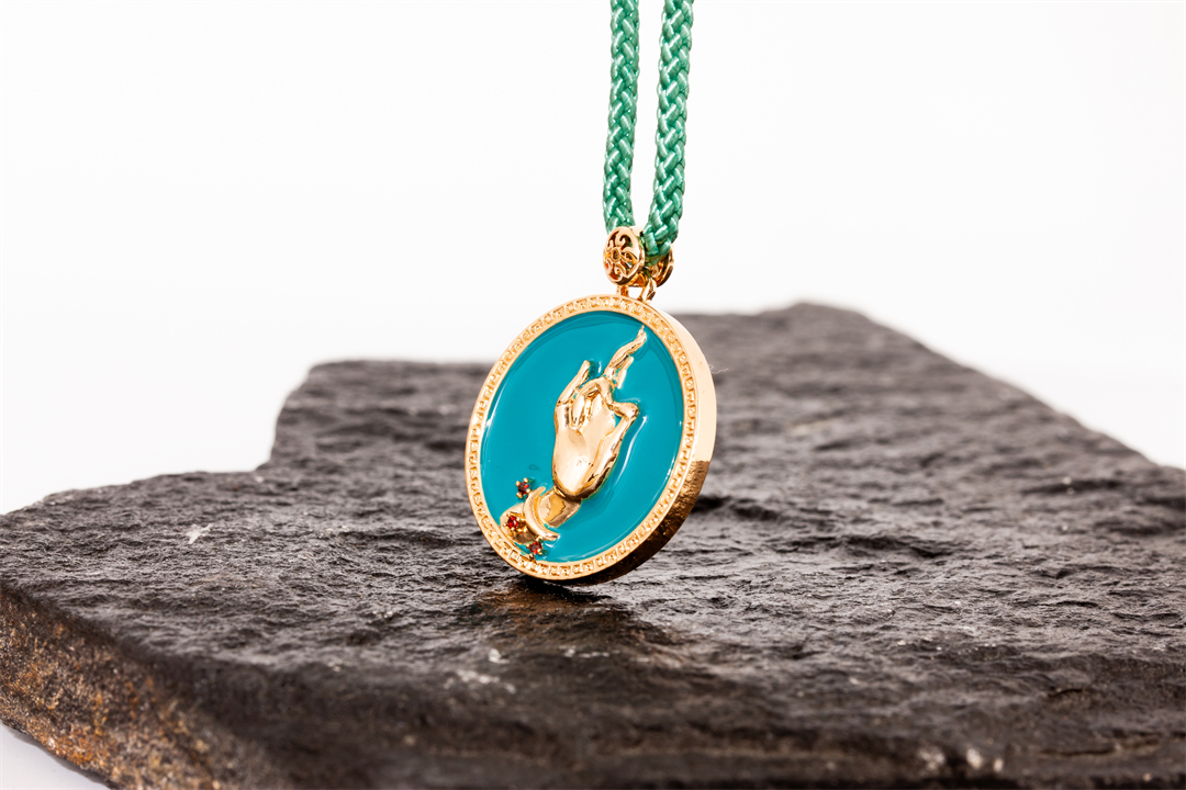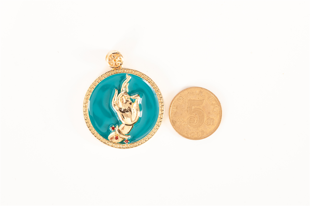 作品材质:主体采用黄铜制作,微镶3颗切面红刚玉(合成),主体镀金,颜色部分为低温珐琅彩。