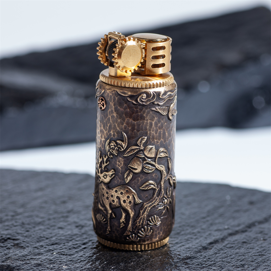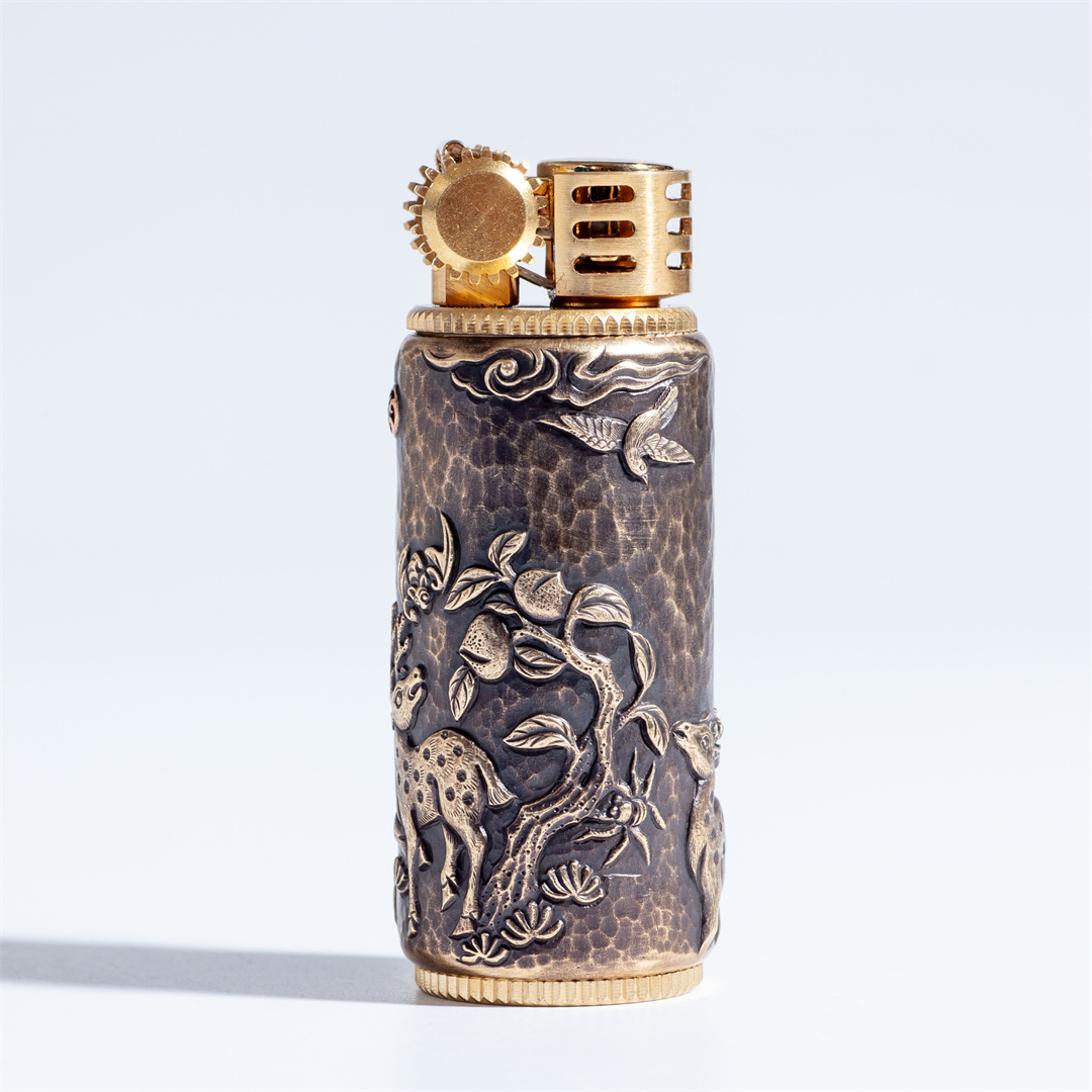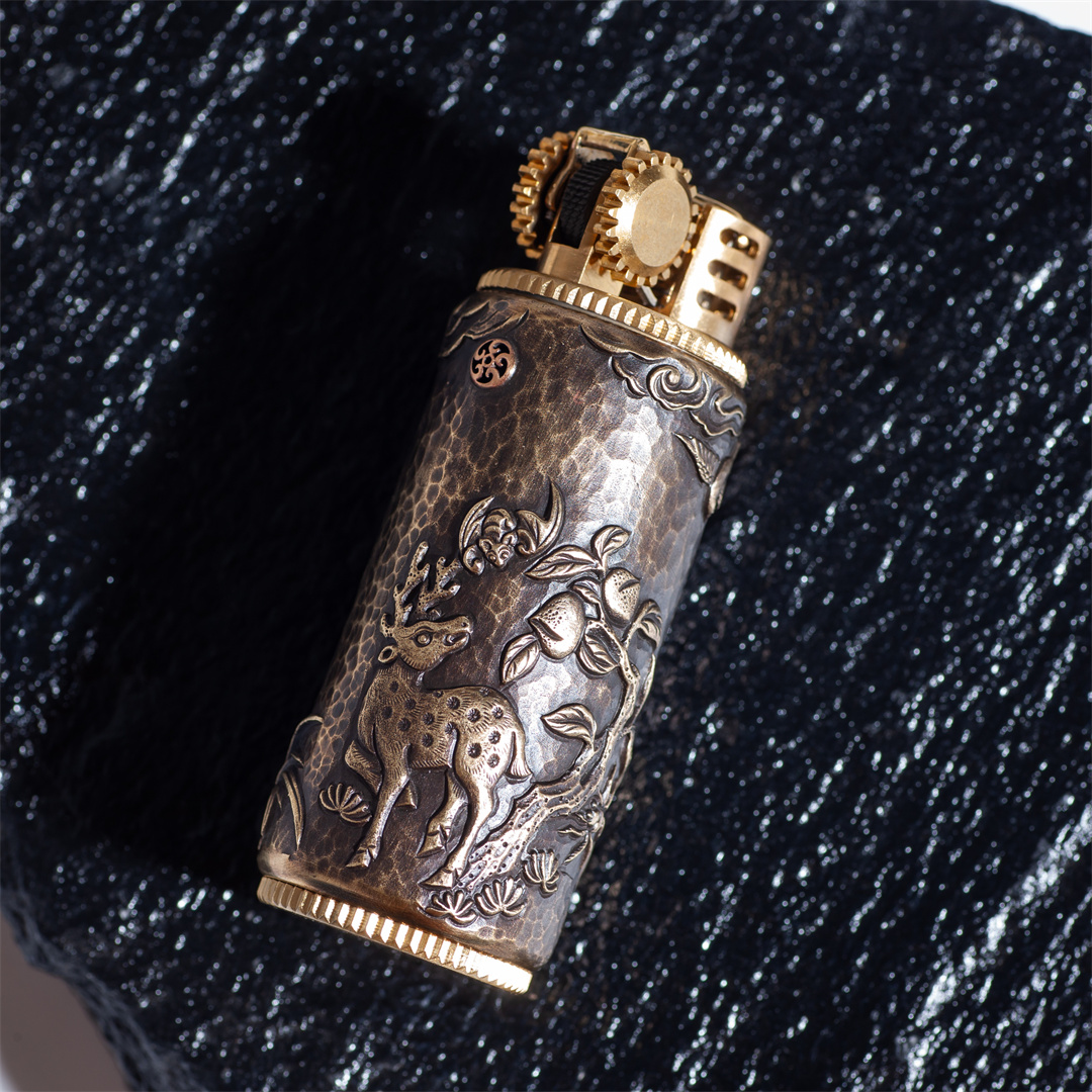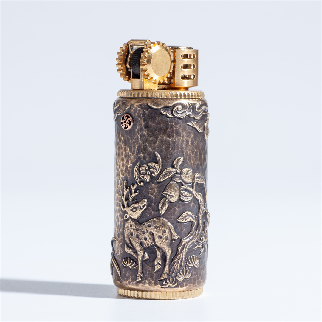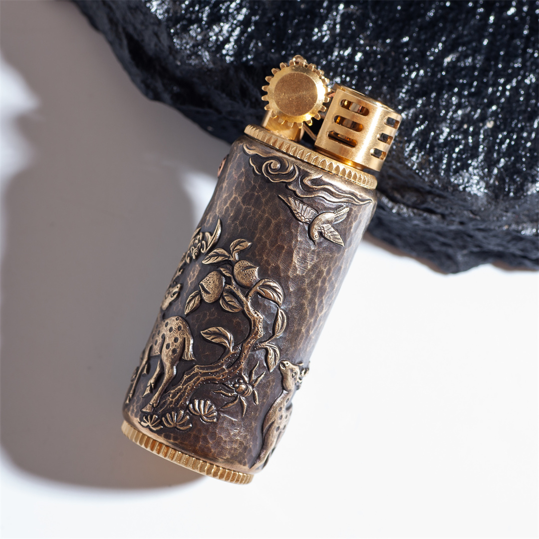 以纯铜为基,融非遗錾刻、浮雕于方寸机身。作品名字取鹿(禄)、桃(寿)、蝙蝠(福)、喜鹊(喜)吉祥四象。一器之上,福至、禄临、寿永、喜临,把东方人对圆满生活的千年祈愿,凝于器中。